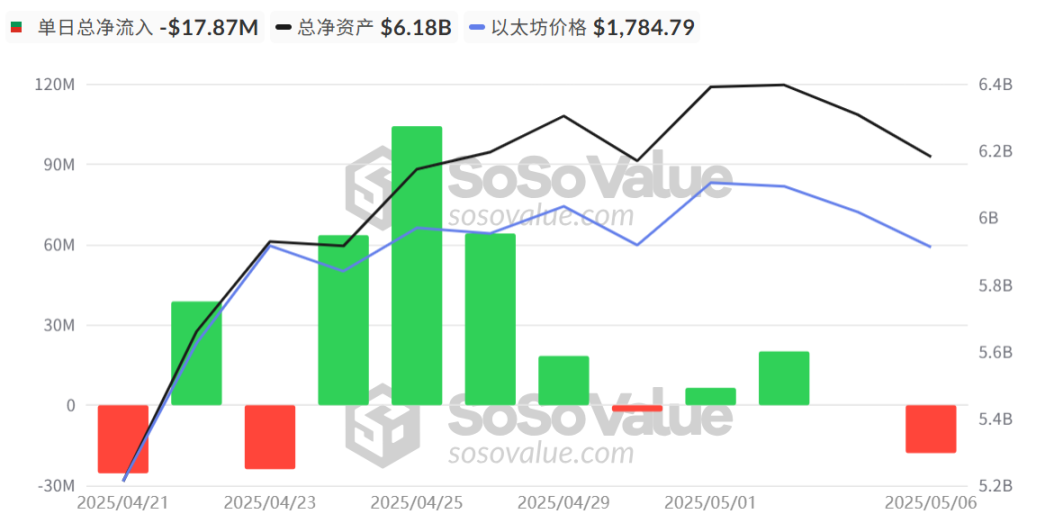 ข้อมูลสำหรับ Ethereum spot ETF ก็ยังเป็นแง่ดีเช่นกัน นับตั้งแต่ปลายเดือนเมษายน มีเงินไหลเข้าสุทธิ 7 วัน รวมถึงเงินไหลเข้าสุทธิ 3 วันเกิน 60 ล้านดอลลาร์สหรัฐ และเงินไหลออกสุทธิสูงสุดในหนึ่งวันไม่เกิน 30 ล้านดอลลาร์สหรัฐ