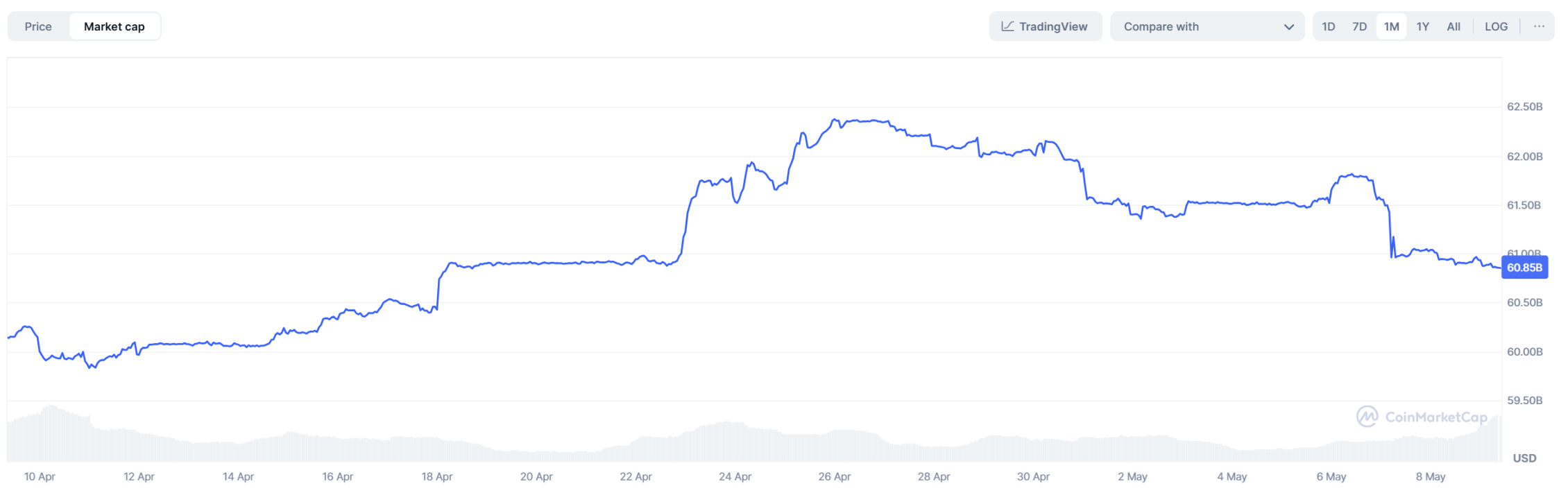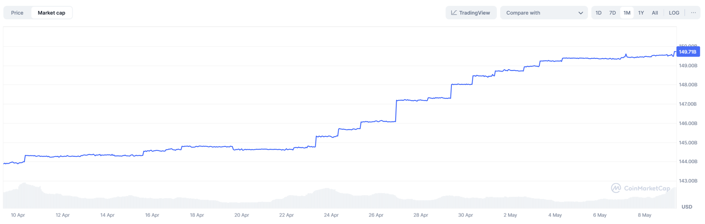 มูลค่าตลาดรวมของ Stablecoin ยังคงเพิ่มสูงใหม่ อ้างอิงจากข้อมูลของ DefiLlama มูลค่าตลาดรวมของ stablecoin ได้แตะระดับ 242,226 พันล้านเหรียญสหรัฐฯ โดยเพิ่มขึ้นในช่วง 7 วันมากกว่า 16,078 ล้านเหรียญสหรัฐฯ USDT เพิ่มขึ้น 3.75% ในเดือนนี้ โดยมีมูลค่าตลาดอยู่ที่ 150,179 ล้านเหรียญสหรัฐ และ USDC เพิ่มขึ้น 1.18% ในเดือนนี้ โดยมีมูลค่าตลาดอยู่ที่ 60,904 ล้านเหรียญสหรัฐ มันได้ลดลงมาตั้งแต่ถึงจุดสูงสุดในช่วงปลายเดือนเมษายน