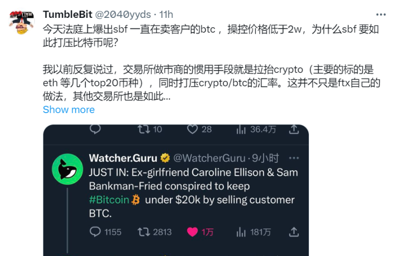 Caroline Ellison ซีอีโอของ Alameda Research และอดีตแฟนสาวของ SBF ให้การเป็นพยานส่วนใหญ่ในการพิจารณาคดีฉ้อโกงทางอาญาของ FTX ในสัปดาห์นี้ ตามคำให้การล่าสุดของ Caroline Ellison และบันทึกการสนทนากับ SBF ที่ SBF จัดทำไว้ SBF ได้สั่งให้ Alameda ขาย BTC ที่ได้รับจากกองทุนลูกค้า FTX และขาย Bitcoin ต่อไปหาก Bitcoin เกิน 20,000 ดอลลาร์สหรัฐ เพื่อรักษาเสถียรภาพของ Bitcoin ราคา คงต่ำกว่า 20,000.