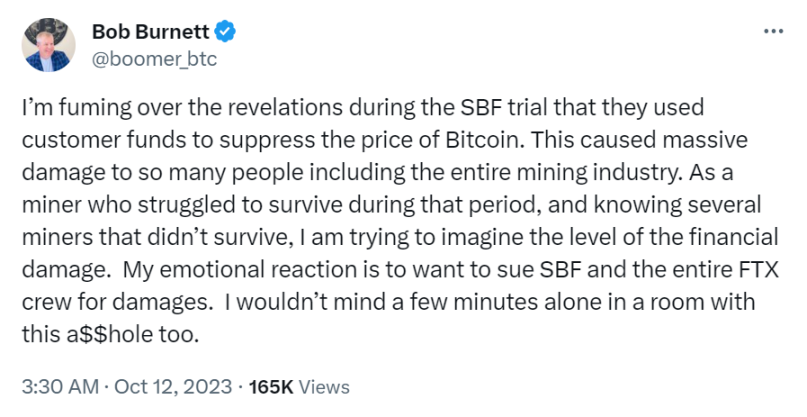 Bob Burnett ประธานและซีอีโอของ Barefoot Mining กล่าวว่า "ฉันรู้สึกโกรธเคืองกับการเปิดเผยระหว่างการทดลองใช้ SBF ว่าพวกเขาใช้เงินทุนของลูกค้าเพื่อลดราคา Bitcoin สิ่งนี้ได้สร้างความสูญเสียครั้งใหญ่ให้กับผู้คนจำนวนมาก รวมถึงอุตสาหกรรมเหมืองแร่ทั้งหมด ในฐานะนักขุดที่ดิ้นรนเอาชีวิตรอดในช่วงเวลานั้นและรู้จักนักขุดบางคนที่ไม่รอดผมจึงพยายามจินตนาการถึงขอบเขตของความเสียหายทางการเงินปฏิกิริยาทางอารมณ์ของผมคือต้องการฟ้องร้อง SBF และเจ้าหน้าที่ FTX ทั้งหมดเพื่อเรียกค่าเสียหาย ฉันก็เหมือนกัน คงไม่รังเกียจที่จะอยู่คนเดียวในห้องที่มีรูนี้สักสองสามนาที”
