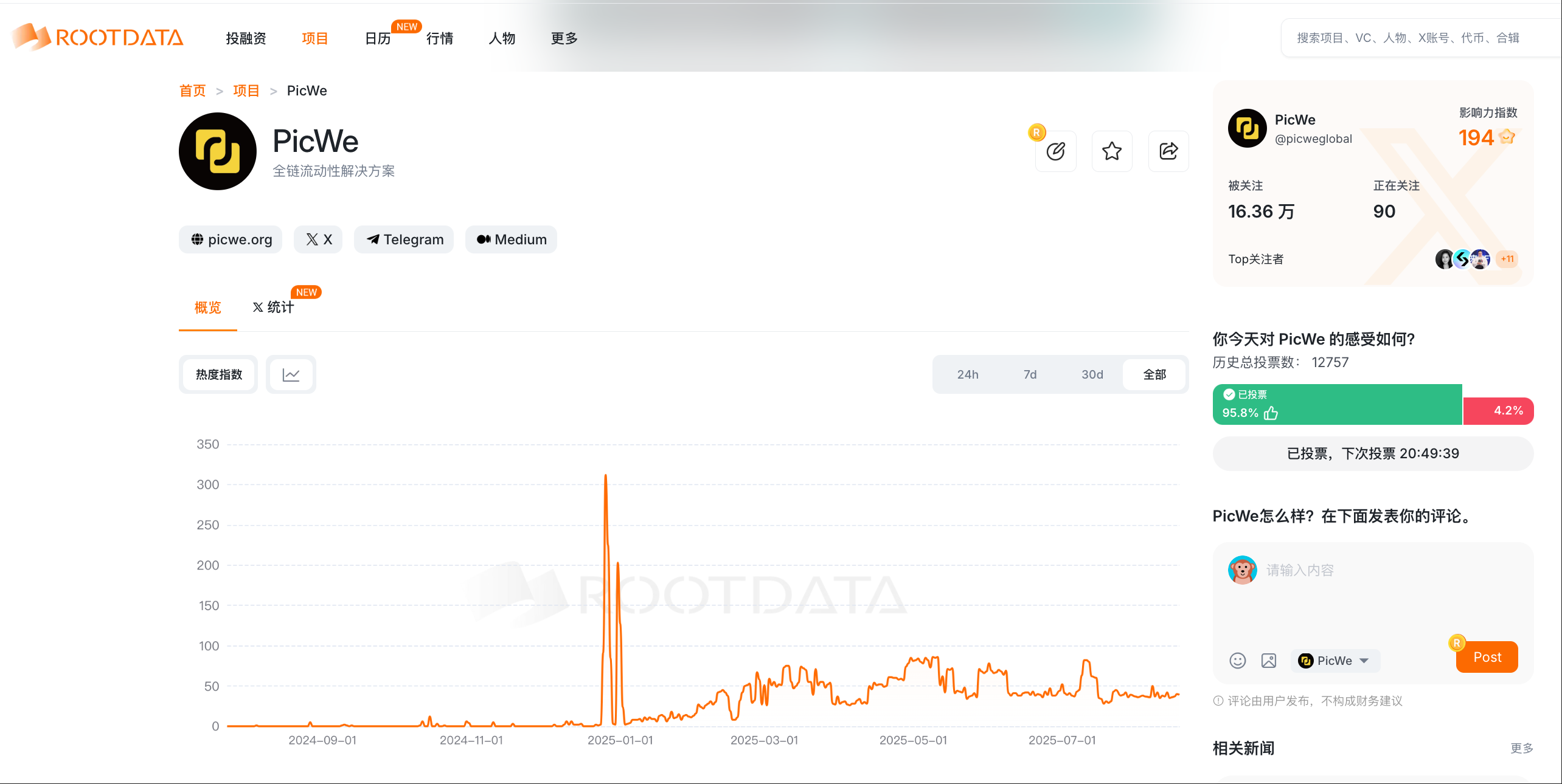 นอกจากนี้ จากข้อมูลการติดตามของแพลตฟอร์มข้อมูลสินทรัพย์ Web3 RootData X ในช่วง 7 วันที่ผ่านมา โซลูชันสภาพคล่องแบบฟูลเชน PicWe ได้กลายเป็นโครงการที่มีผู้ติดตาม Top Figure (Twitter) รายใหม่มากที่สุดถึง X ราย ผู้ทรงอิทธิพลรายใหม่ที่ติดตามโครงการนี้ ได้แก่ Phyrex นักวิเคราะห์คริปโตเคอร์เรนซี (@Phyrex_Ni) และ Enheng ผู้ทรงอิทธิพลในวงการคริปโต (@enheng456)