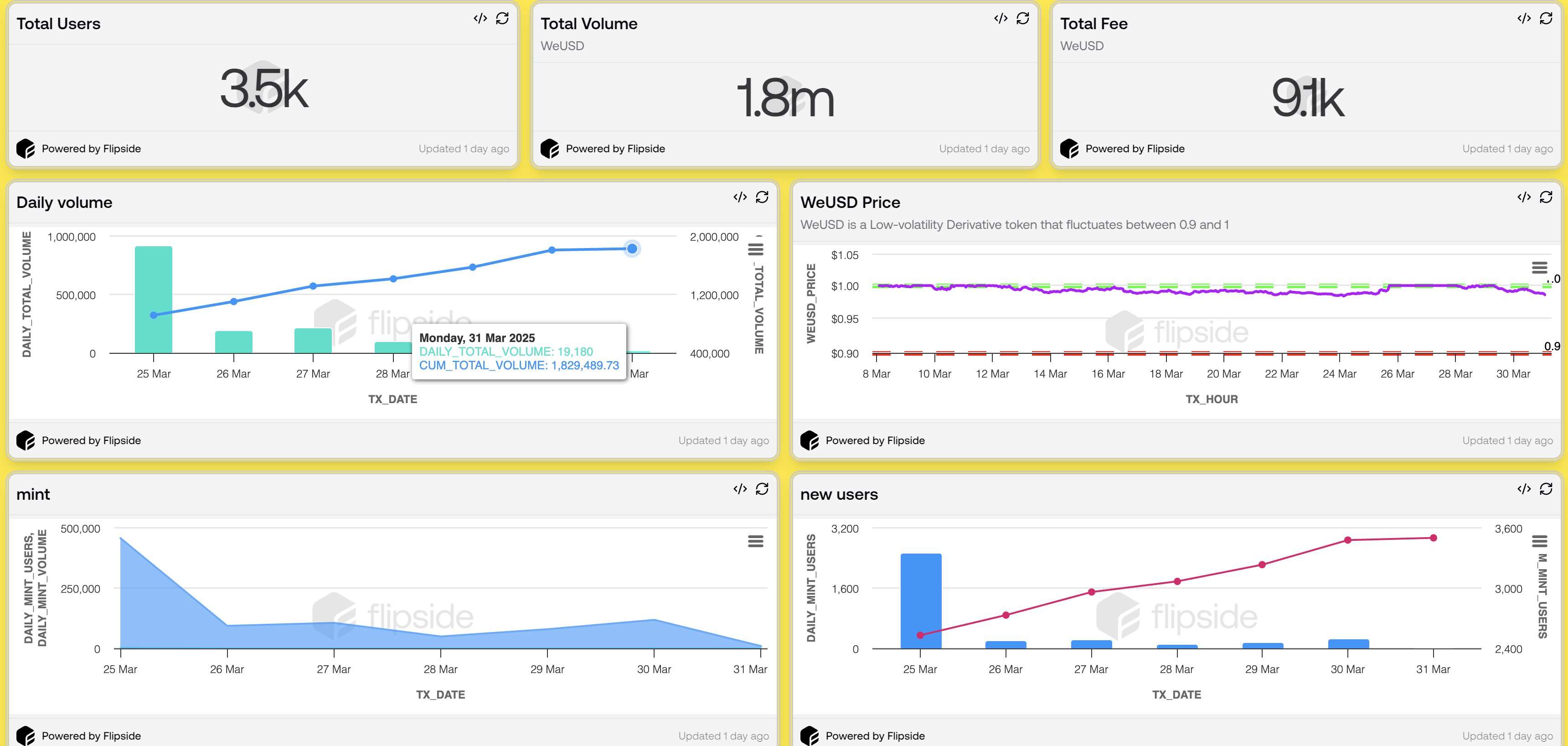 ตามข้อมูลของ Flipside ในช่วงสองสัปดาห์ที่ผ่านมา สกุลเงินดิจิทัลเสถียรของเครือข่ายสาธารณะของ Movement อย่าง WEUSD ได้มีการโต้ตอบอย่างแข็งขัน โดยมีที่อยู่เครือข่ายมากกว่า 10% เข้าร่วมใน Mint และปริมาณธุรกรรมสะสมเกิน 2.5 ล้านเหรียญสหรัฐ