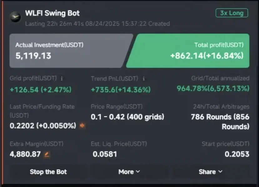 นอกจากการถือครองโดยตรงแล้ว ผมยังรันบอทเทรด $WLFI บน Pionex ด้วย ช่วงกริดตั้งไว้ระหว่าง $0.10 ถึง $0.42 ภายในเวลาเพียง 22 ชั่วโมง บอทนี้สร้างกำไรไปแล้ว 2.5% (ผลตอบแทนต่อปี 960%) สำหรับนักลงทุนที่ไม่ต้องการถือครองระยะยาว ความผันผวนเพียงอย่างเดียวก็สามารถสร้างผลตอบแทนที่สำคัญได้