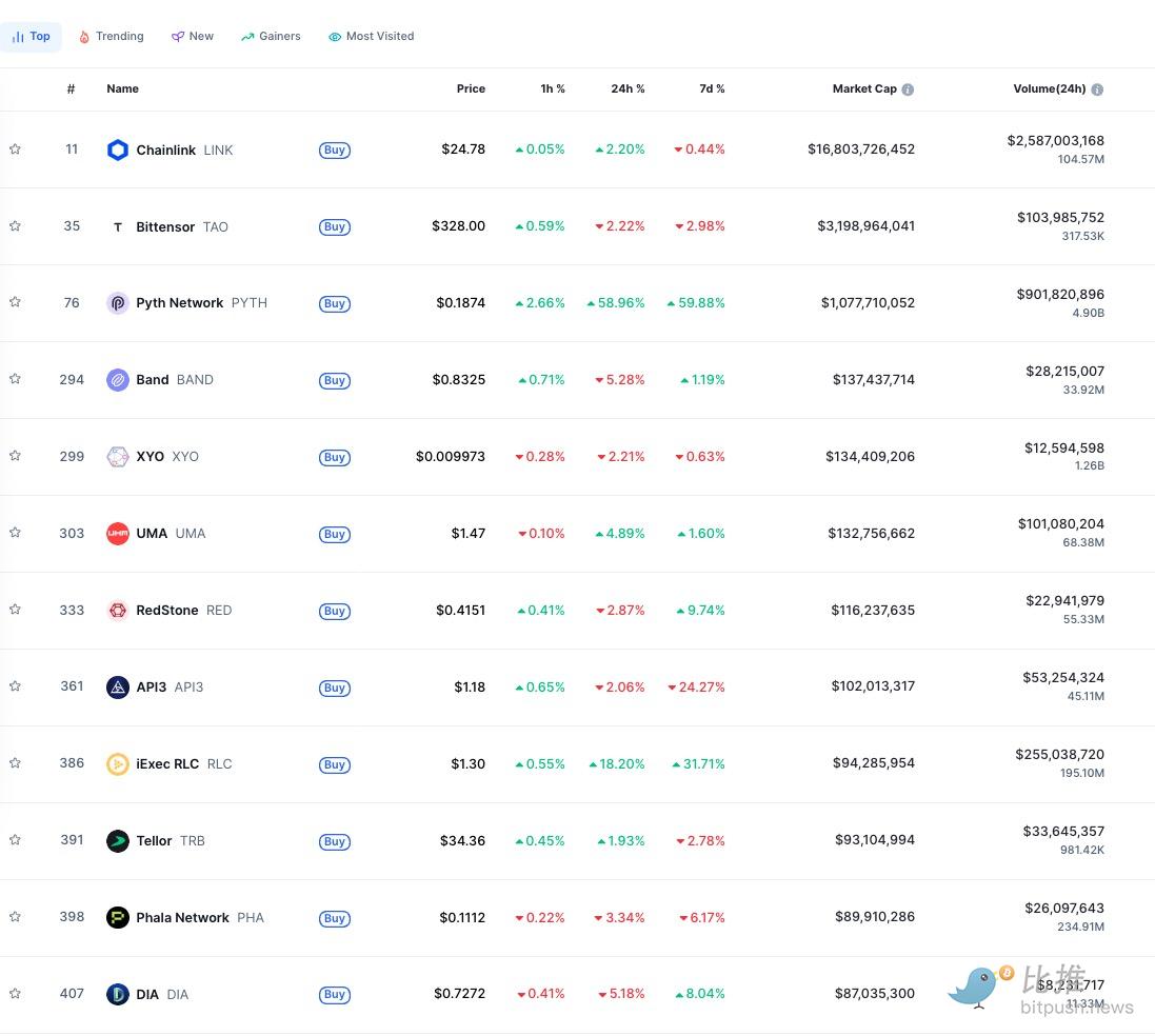 Pyth ถือเป็นดาวรุ่งพุ่งแรงในปีที่ผ่านมา ด้วยข้อได้เปรียบด้านข้อมูลทางการเงินความถี่สูงและการกระจายข้ามเครือข่าย Pyth จึงได้รับความนิยมเพิ่มขึ้นอย่างรวดเร็วในระบบนิเวศการแลกเปลี่ยน ปัจจุบัน Pyth ได้รับการรับรองอย่างเป็นทางการแล้ว และมูลค่าตลาดของ Pyth ก็เพิ่มขึ้นอย่างมาก แม้ว่ามูลค่าตลาดของ Pyth จะเพียงหนึ่งในสิบของ LINK แต่การเติบโตอย่างรวดเร็วและความสามารถในการขยายระบบนิเวศ ทำให้ Pyth เป็นสตาร์ทอัพรายเดียวที่มีโอกาสท้าทายสภาพแวดล้อมเดิมๆ
