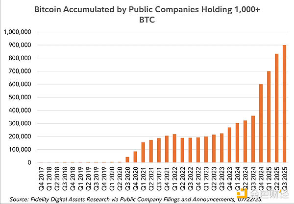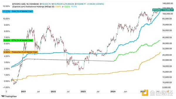 แผนภูมินี้แสดงให้เห็นอย่างชัดเจนถึงการเปลี่ยนแปลงของสถาบันในตลาด Bitcoin ซึ่งเป็นหัวใจสำคัญของ DAT Summer ปัจจุบัน มูลค่าตลาดของ Bitcoin มากกว่า 11.17% ถือครองโดยสถาบัน โดยกองทุนซื้อขายแลกเปลี่ยน (ETF) ถือครอง 6.52% และพันธบัตรรัฐบาลขององค์กรธุรกิจถือครอง 4.64% สิ่งที่เริ่มต้นจากการสะสมสินทรัพย์แบบกระจัดกระจายโดยองค์กรธุรกิจที่กล้าหาญเพียงไม่กี่แห่งในระยะแรก ได้พัฒนาเป็นวงจรที่หมุนวนอย่างเต็มรูปแบบ โดยเฉพาะอย่างยิ่งหลังจากปี 2023 โดยมีเงินทุนไหลเข้า ETF จำนวนมากและราคา Bitcoin พุ่งสูงขึ้น การเปลี่ยนแปลงนี้สะท้อนให้เห็นถึงช่วงที่สองของ "การกระตุ้น" ซึ่งเงินทุนที่มีโครงสร้างที่วอลล์สตรีทระดมทุนผ่าน ETF และการจัดหาเงินทุน กำลังขับเคลื่อนสภาพคล่อง โมเมนตัม และเรื่องราวต่างๆ การเติบโตอย่างมากของ ETF และการถือครองพันธบัตรรัฐบาลขององค์กรธุรกิจไม่ได้เป็นเพียงแค่กิจกรรมทางการเงินเท่านั้น แต่ยังเป็นสัญญาณบ่งชี้ถึงการที่ Bitcoin กลายเป็นสถาบันในฐานะสินทรัพย์ในงบดุลและเครื่องมือในตลาดทุน กล่าวโดยสรุป แผนภูมินี้เป็นหลักฐานที่ชัดเจนที่สุดเท่าที่เคยมีมา: Bitcoin ได้กลายเป็นสินทรัพย์ประเภทองค์กรไปแล้ว