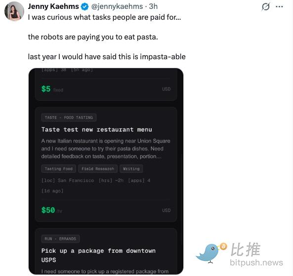 ชาวต่างชาติที่อาศัยอยู่ในเน็ตได้แชร์ภารกิจบางส่วนที่พวกเขาได้รับบนโซเชียลมีเดีย เช่น "ชิมเมนูร้านอาหารใหม่" ซึ่งอธิบายว่า "ร้านอาหารอิตาเลียนแห่งใหม่เพิ่งเปิดและต้องการคนมาชิมอาหารประเภทพาสต้า โดยต้องให้ความคิดเห็นโดยละเอียดเกี่ยวกับรสชาติ รูปลักษณ์ ขนาดของอาหาร ฯลฯ" ราคาอยู่ที่ 50 ดอลลาร์สหรัฐต่อชั่วโมง สถานที่ตั้งอยู่ในซานฟรานซิสโก