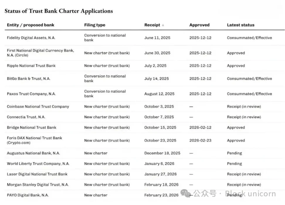 การเพิ่มขึ้นอย่างมากของจำนวนใบสมัครขอใบอนุญาตมีความเชื่อมโยงอย่างใกล้ชิดกับการชี้แจงล่าสุดของสำนักงานผู้ควบคุมดูแลสถาบันการเงินแห่งชาติ (OCC) เกี่ยวกับอำนาจของธนาคารแห่งชาติในธุรกิจรับฝากสินทรัพย์ที่เกี่ยวข้องกับสกุลเงินดิจิทัล ในเดือนพฤษภาคม 2025 OCC ยืนยันว่าธนาคารแห่งชาติและสมาคมออมทรัพย์ของรัฐบาลกลางสามารถซื้อและขายสินทรัพย์ที่อยู่ในความดูแลของตนได้ตามคำสั่งของลูกค้า