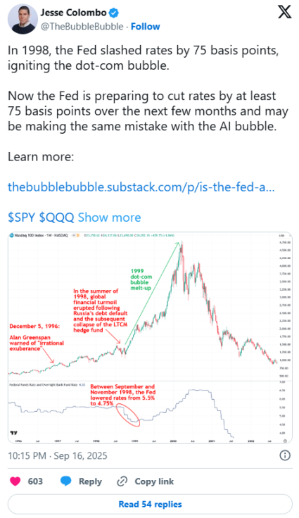 พาวเวลล์ยังกล่าวในวันนี้ว่าอาจมีการปรับลดอัตราดอกเบี้ยอีกสองครั้งก่อนสิ้นปี ซึ่งจะทำให้ผลตอบแทนของกองทุนตลาดเงินลดลงอีก และอาจผลักดันให้ผู้ลงทุนหันไปลงทุนในสินทรัพย์ที่ต้านทานภาวะเงินเฟ้อ เช่น บิตคอยน์และทองคำ รวมไปถึงสินทรัพย์เสี่ยง เช่น หุ้นเทคโนโลยีและปัญญาประดิษฐ์