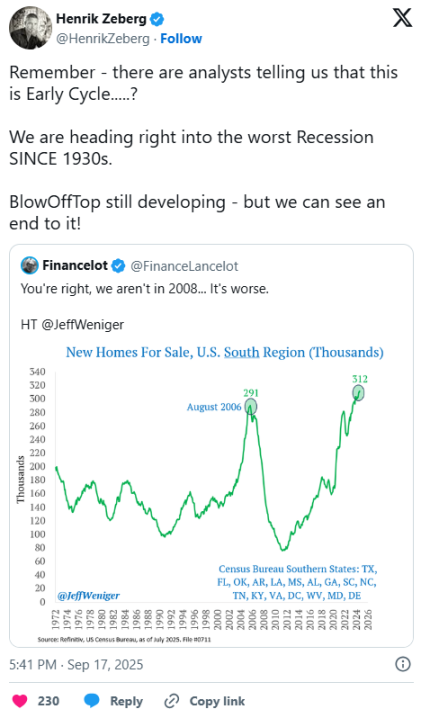 เหตุผลของ Henrik Zeberg ได้แก่ การที่เศรษฐกิจจริงมีภาวะชะงักงัน ซึ่งส่วนหนึ่งก็เห็นได้จากจำนวนบ้านที่อยู่ในตลาด