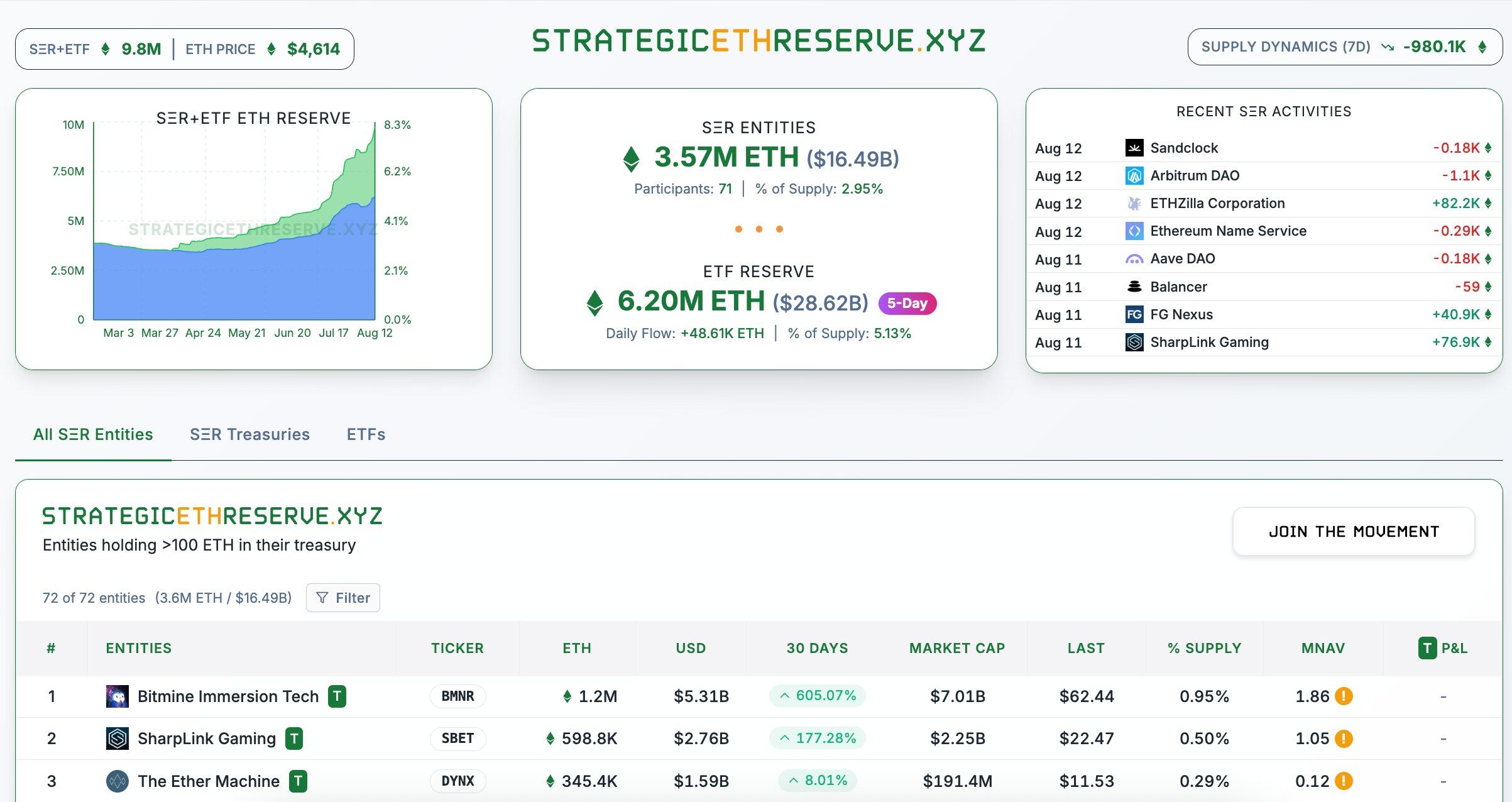 ข้อมูลจากเว็บไซต์ StrategyEthreserve ระบุว่า ทุนสำรองสะสมของ ETH โดยหน่วยงานต่างๆ มีมูลค่าเกินกว่า 3.57 ล้าน ETH คิดเป็นมูลค่าประมาณ 1.65 หมื่นล้านดอลลาร์สหรัฐ Bitmine และ Sharplink อยู่ในอันดับที่ 1 และ 2 โดยมีทุนสำรองอยู่ที่ 1.2 ล้าน และ 600,000 ETH ตามลำดับ