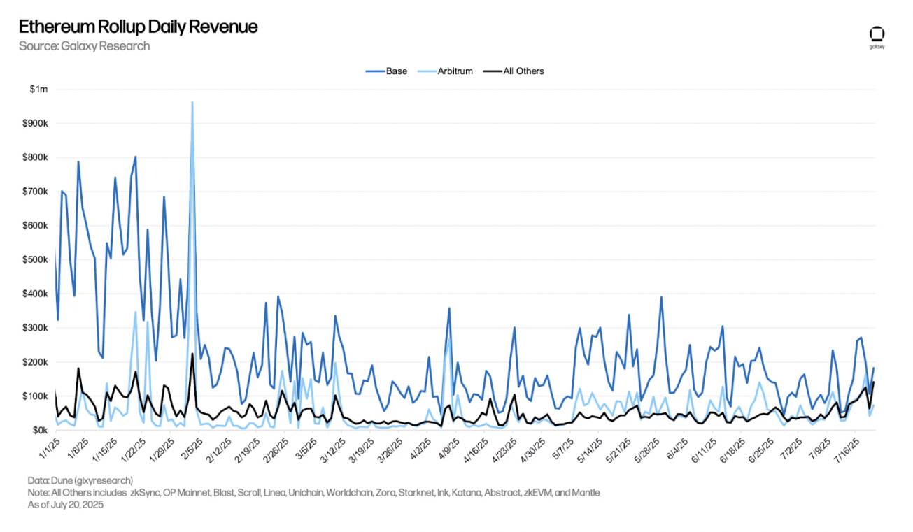 ในปีนี้จนถึงขณะนี้ รายได้รวมของ Base อยู่ที่ 33.4 ล้านเหรียญสหรัฐ ของ Arbitrum อยู่ที่ 9.9 ล้านเหรียญสหรัฐ และเครือข่าย L2 อีก 14 เครือข่ายอยู่ที่ 8.4 ล้านเหรียญสหรัฐ