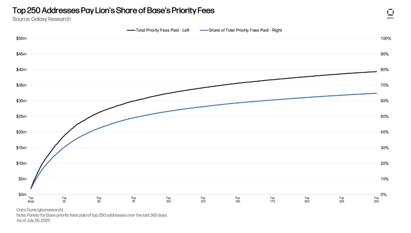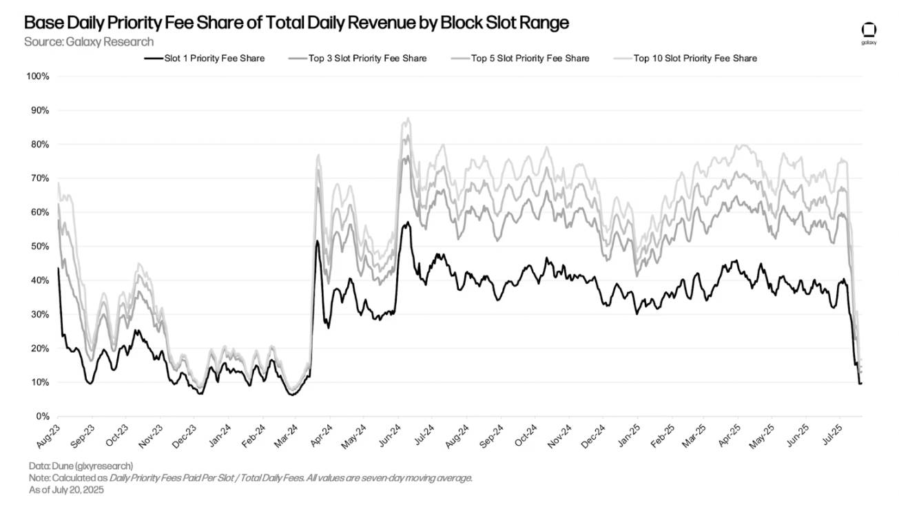 โดยเฉพาะอย่างยิ่ง ค่าธรรมเนียมลำดับความสำคัญสำหรับช่องบนสุดของบล็อกฐานเป็นปัจจัยสำคัญที่ส่งผลต่อรายได้จากตัวเรียงลำดับ เนื่องจากผู้ใช้แข่งขันกันเพื่อแย่งชิงตำแหน่งใกล้ด้านบนของบล็อก ค่าธรรมเนียมลำดับความสำคัญที่จ่ายโดยธุรกรรมในช่องแรกของบล็อกเพียงอย่างเดียวมีส่วนช่วยสร้างรายได้รายวัน 30% ถึง 45% ตั้งแต่ปี 2025 นอกจากนี้ ค่าธรรมเนียมลำดับความสำคัญที่จ่ายโดยธุรกรรมใน 10 ช่องบนสุดของแต่ละบล็อกยังมีส่วนช่วยสร้างรายได้รายวัน 50% ถึง 80% ในช่วงเวลาเดียวกัน อย่างไรก็ตาม ในช่วงหลายสัปดาห์หลังจากวันที่ 5 กรกฎาคม ส่วนแบ่งของค่าธรรมเนียมลำดับความสำคัญสำหรับช่องบนสุดในรายได้รวมรายวันลดลงอย่างมาก ซึ่งเป็นผลมาจากสองปัจจัย ได้แก่ 1) ปริมาณการใช้งานที่เพิ่มขึ้นทำให้ค่าธรรมเนียมขั้นพื้นฐานสูงขึ้น ซึ่งทำให้ส่วนแบ่งรายได้จากค่าธรรมเนียมลำดับความสำคัญลดลง และ 2) การนำ "Flashblocks" มาใช้ในวันที่ 16 กรกฎาคม (รายละเอียดเพิ่มเติมด้านล่าง) ทำให้ธุรกรรมที่มีความสำคัญสูงตกไปอยู่ในช่องที่ต่ำกว่าในบล็อก (แต่เราจะเห็นว่านี่ไม่ใช่เรื่องเลวร้าย)