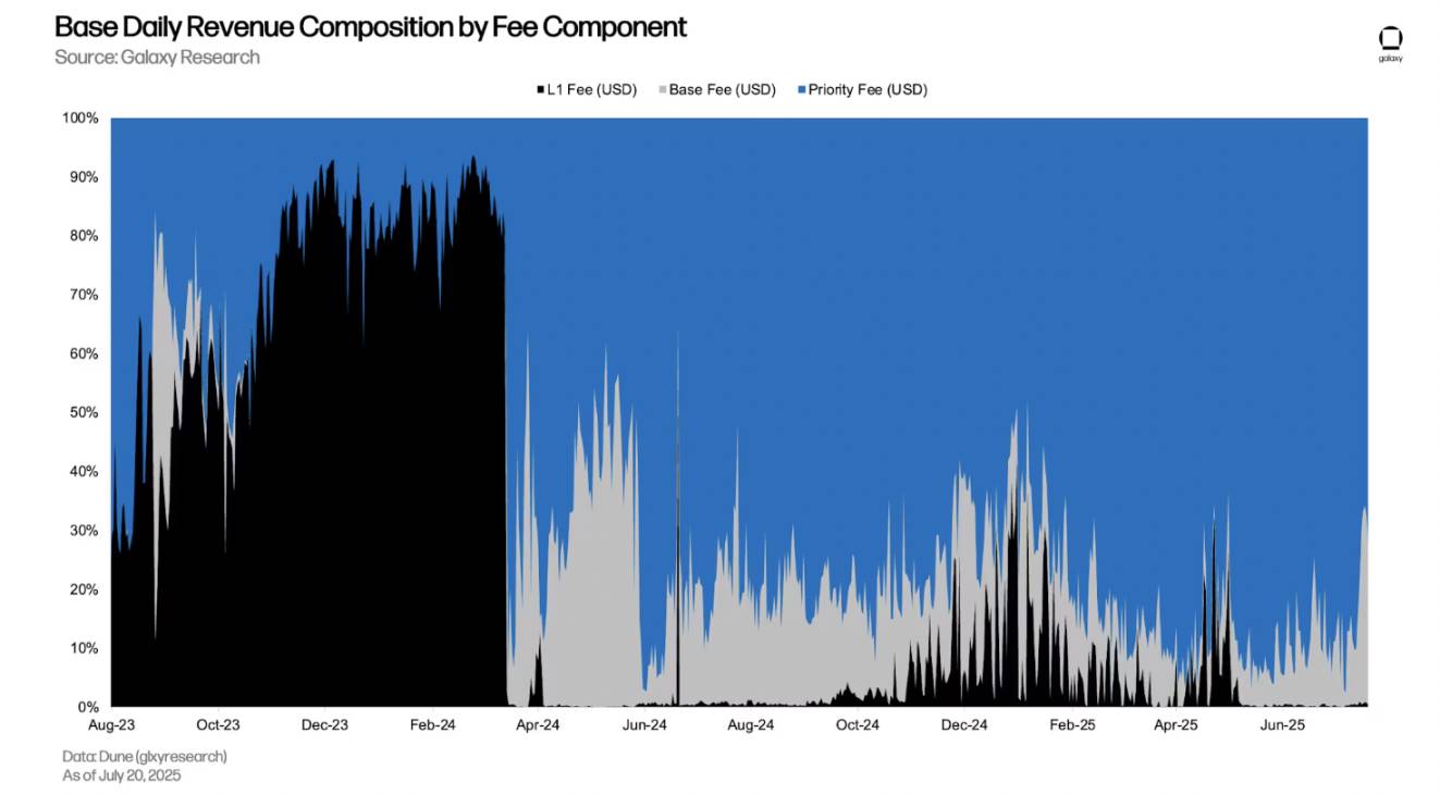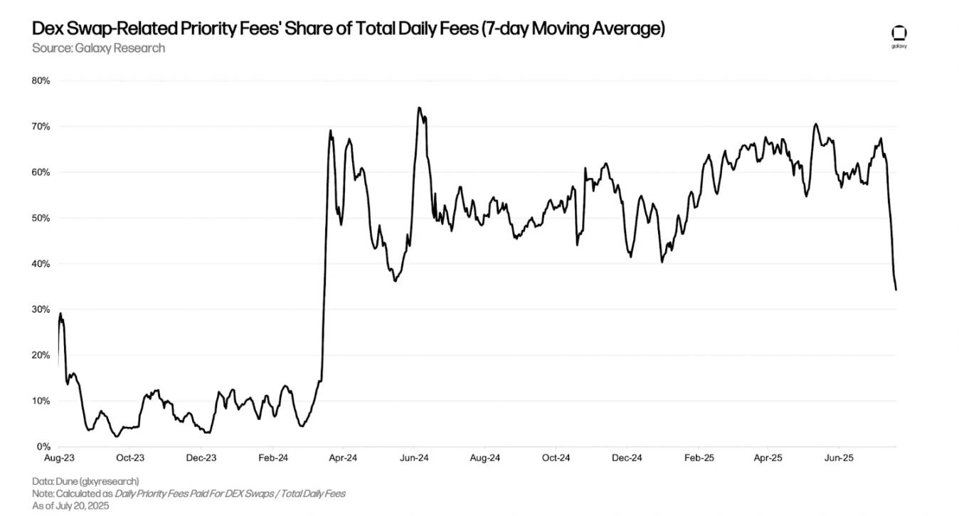กิจกรรม DEX ระดับสูงเป็นเหตุผลสำคัญที่ทำให้ค่าธรรมเนียมลำดับความสำคัญพื้นฐานยังคงสูง ค่าธรรมเนียมรายวันรวมที่ระบบจัดเรียงข้อมูลแบบ Base เรียกเก็บนั้น 50% ถึง 70% มาจากค่าธรรมเนียมลำดับความสำคัญสำหรับธุรกรรม DEX อย่างไรก็ตาม ตั้งแต่วันที่ 7 กรกฎาคม สัดส่วนค่าธรรมเนียมธุรกรรม DEX เทียบกับค่าธรรมเนียมรายวันรวมลดลงจาก 67% เหลือเพียง 34% สาเหตุมาจากสองปัจจัย: 1) การเพิ่มขึ้นของค่าธรรมเนียมพื้นฐานทำให้สัดส่วนของค่าธรรมเนียมลำดับความสำคัญลดลง; 2) การแข่งขันที่รุนแรงขึ้นสำหรับพื้นที่บล็อกบนเชนบังคับให้ผู้ใช้ต้องจ่ายค่าธรรมเนียมลำดับความสำคัญสำหรับธุรกรรมที่ไม่ใช่ DEX