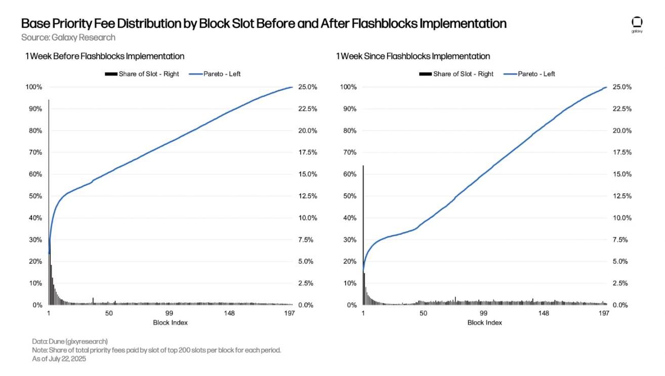 ภาพต่อไปนี้แสดงความแตกต่างในการกระจายค่าธรรมเนียมตามลำดับความสำคัญของช่องบล็อก 200 ช่องแรกก่อนและหลังการใช้งาน Flashblocks กราฟแท่งสีดำแสดงส่วนแบ่งค่าธรรมเนียมตามลำดับความสำคัญของแต่ละช่อง ส่วนเส้นสีน้ำเงินแสดงส่วนแบ่งสะสมของช่องทั้งหมดจนถึงช่องนั้น (การกระจายแบบพาเรโต)